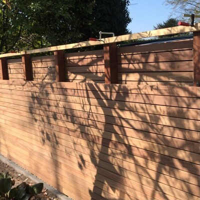 Entscheiden Sie sich für eine einseitige Verkleidung? In diesem Fall montieren Sie die breiten 9,0 cm Lamellen auf Ihrer Seite des Zauns. Dies sorgt für eine moderne Optik, während die Azobé-Pfosten auf der Rückseite (beim Nachbarn) sichtbar bleiben.