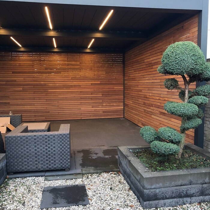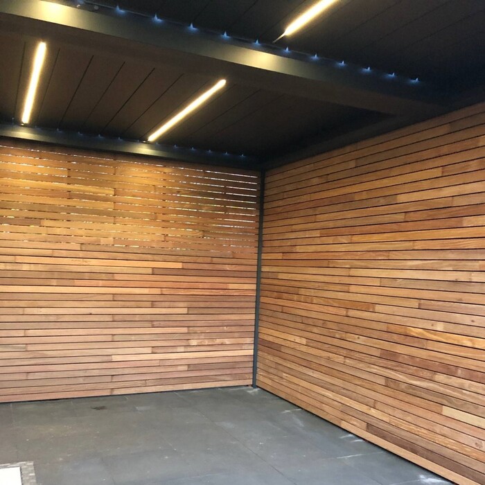 Wie auf den Fotos zu sehen ist, haben wir die Dielen unten nach oben montiert, um an der Oberseite unserer Überdachung ein möglichst sauberes Ergebnis zu erzielen. Das hat hervorragend geklappt. Auch die Montage von unten nach oben ist gut machbar. Für das erste Stück ist es jedoch ratsam, zu dritt zu sein, um die ersten zwei Reihen in einem Rutsch zu befestigen. Danach lässt es sich problemlos zu zweit arbeiten. Der Tipp, auch an den Stirnkantenverbindungen Clips zu setzen, war goldwert! Sonst hätten wir das erst auf halbem Weg oder am Ende bemerkt... und dann wären die Linien langfristig nicht so schön geblieben. Für das beste Ergebnis haben wir die Lamellendielen noch leicht angeschliffen, abgewischt und anschließend mit Hartholzöl behandelt. Wir haben uns für ein dunkles Öl entschieden, wodurch das Holz eine noch schönere und wärmere Farbe erhält. Mit dem Endergebnis sind wir super zufrieden."